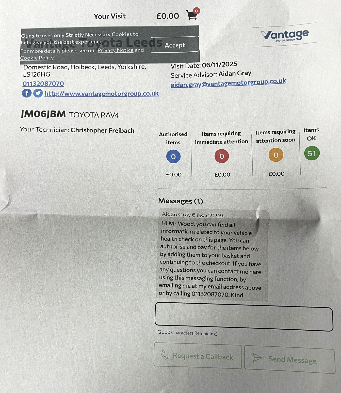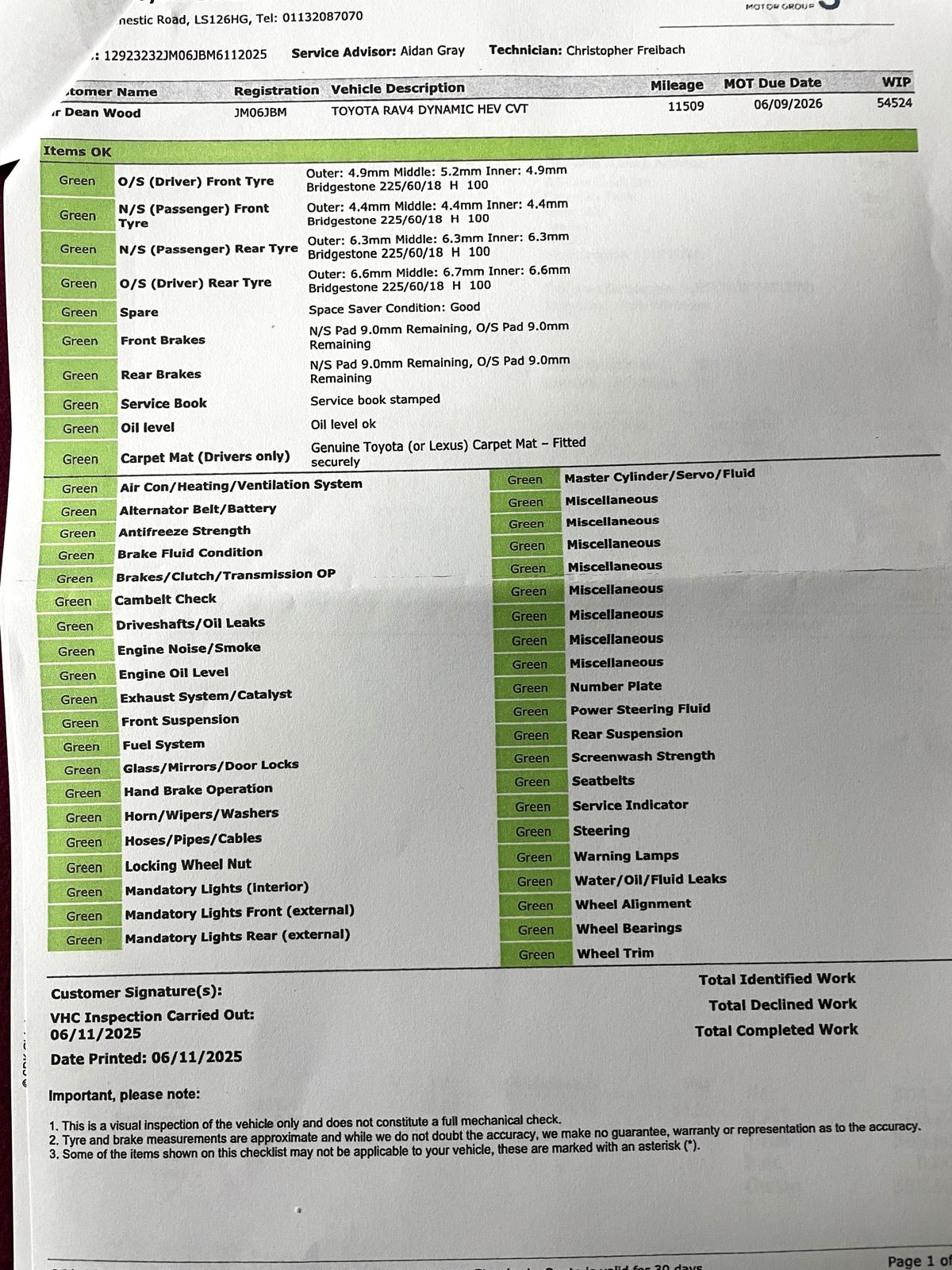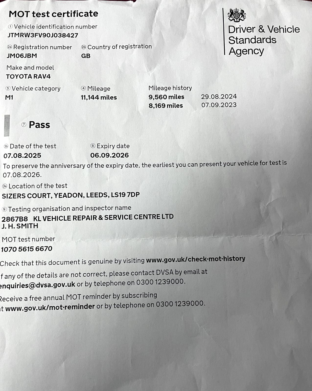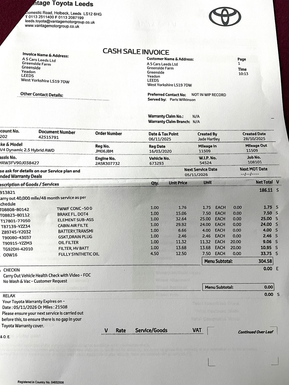 Toyota Rav 4 Dynamic, 2.5 VVT-I Hybrid petrol electric, 4WD, HEV, CVT automatic, S/S Euro 6, in Decuma grey bi tone metallic with black leather heated electric seats with blue stitching, Piano black interior trim with gloss black mirrors and roof rails, The car has a private plate which can stay on the car or revert to its origional number YD20FCG, TFT touch screen satellite navigation with multimedia display, front and rear park distance with reverse camera, also has front and rear Nextbase traffic camera recording, Multifunction leather steering wheel with on board computer, voice recognition blue tooth hands free phone system, cruise control with adjustable speed limiter, drive mode options from Eco, Normal, sport or EV, 4WD Trailmode option, 18" alloy wheels on premium matching Bridgestone tyres with locking wheel key and space saver spare wheel and tyre, DAB radio with usb and aux ports, in car entertainment, Mirror link via usb, Lane departure and lane assist, blind spot monitor, park assist with reverse camera, ABS, traction control, cyclist detection, hill start assist, night time pedestrian detection, road sign assist, electric windows with gloss black electric power folding mirrors with puddle lamps, auto lights with high beam assist and day time running lights, duel zone climate control, privacy glass, remote open close tailgate, fitted mats to the front and rear, Same family owned vehicle with Toyota service history, last serviced 06/11/2026 at 11509 miles, major service, Mot to 06/09/2026 with no advisories. Each year the car is serviced with Toyota it extends the warranty a further year or 10,000 miles upto 10 year old or 100.000 miles.